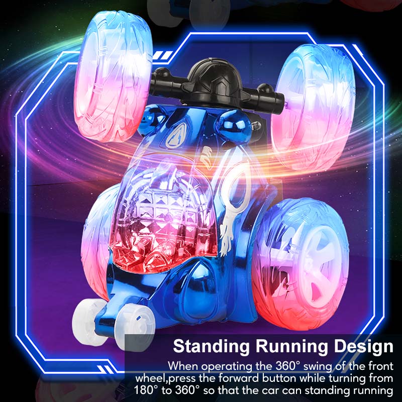 - 【Rotating Remote Control Car】 The car can go forward, backward, turn left, turn right, and walk 90 degrees upright. And the remote-controlled car with a 360-degree rotating front axle for flip fun.