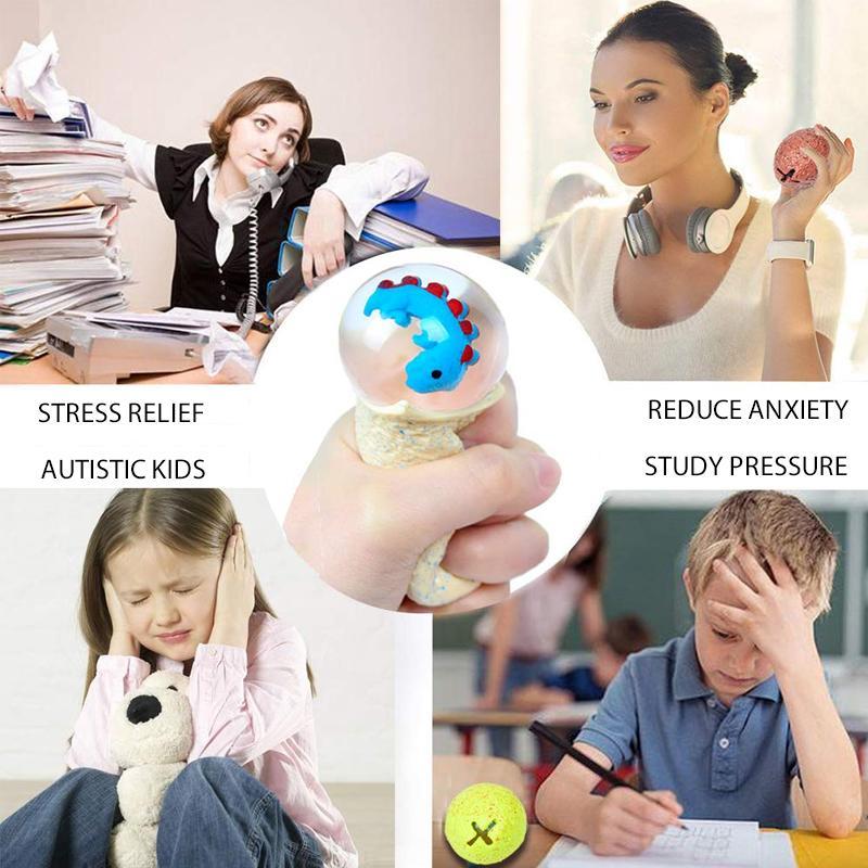 Stress relief balls are unique shape, there is a small dinosaur in the eggshell inside, forcing squeeze, dinosaur head will emerge, very fun.