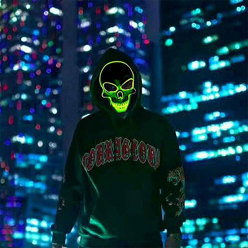 Portable Skeleton LED Mask: Halloween mask can perfectly conform to the curves of your face. Elastic band with adjustable belt also equipped for easy adjusting and maximum comfortable.Clip the power pack to your pocket or onto your clothing. Takes 2* AA batteries (Not included).