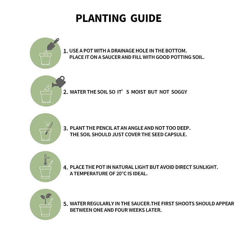 - 8 graphite pencils tipped with seed capsules for growing herbs such as basil, flax and thyme.